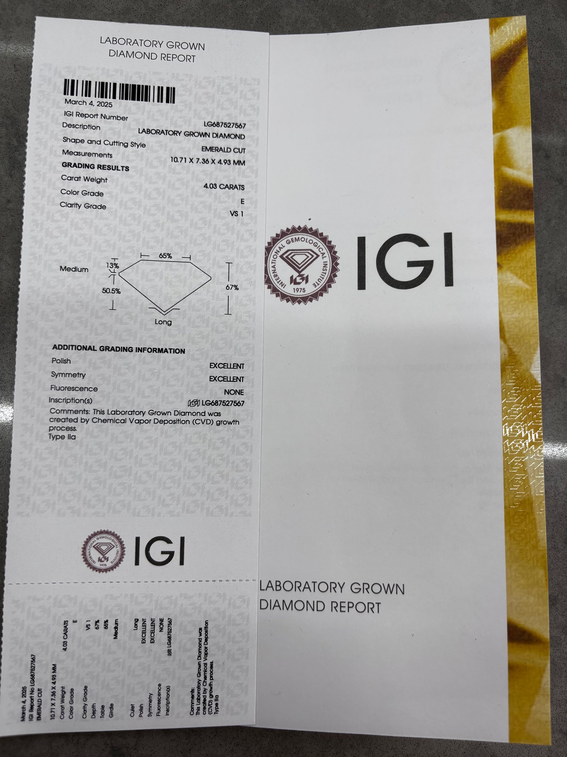 - Centre Stone: 4.03ct Emerald Cut, VS1, E Colour