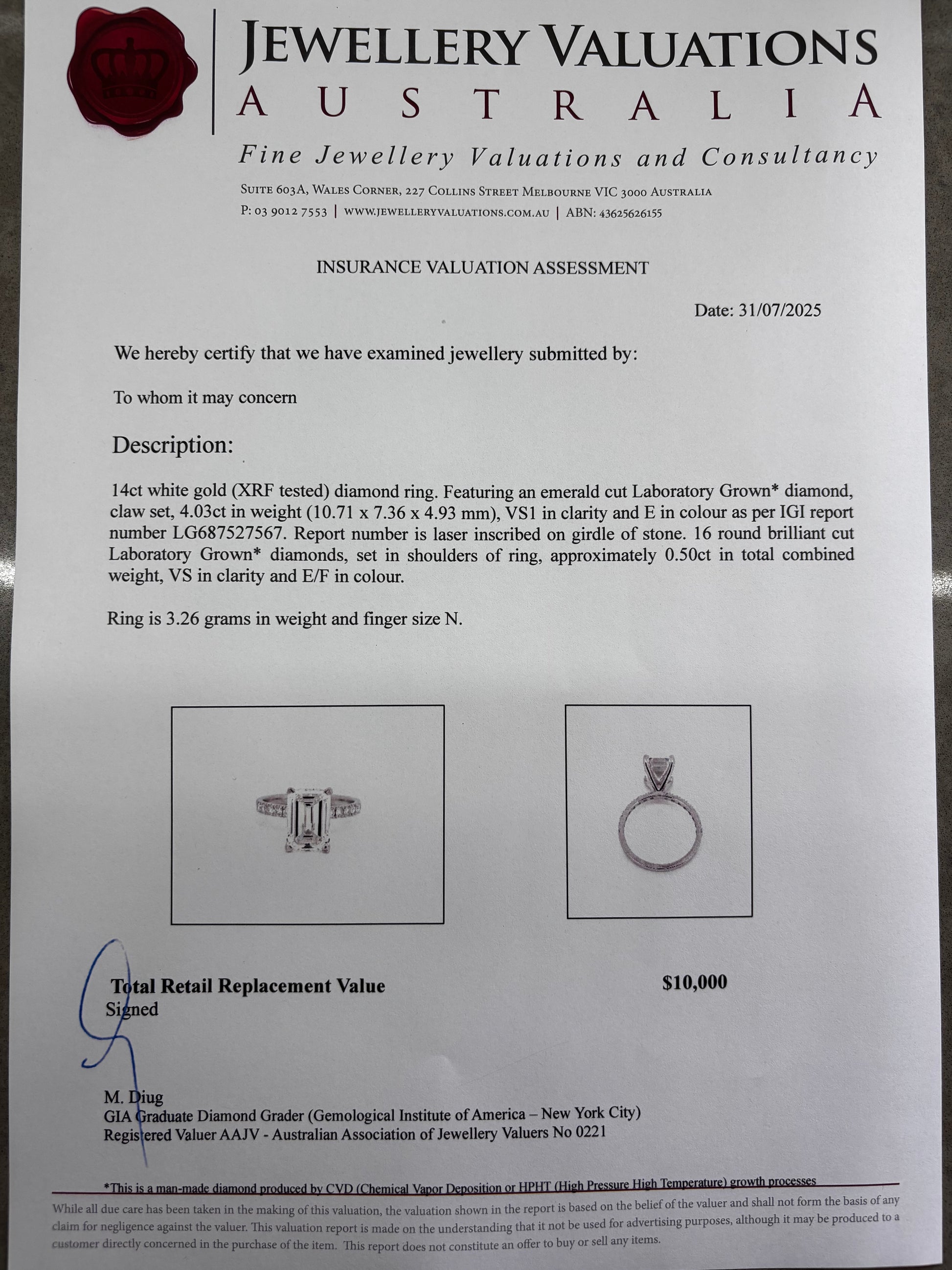 Elevate your jewellery collection with this striking 4.03ct emerald cut lab-grown diamond ring, set in solid 14Kt white gold.