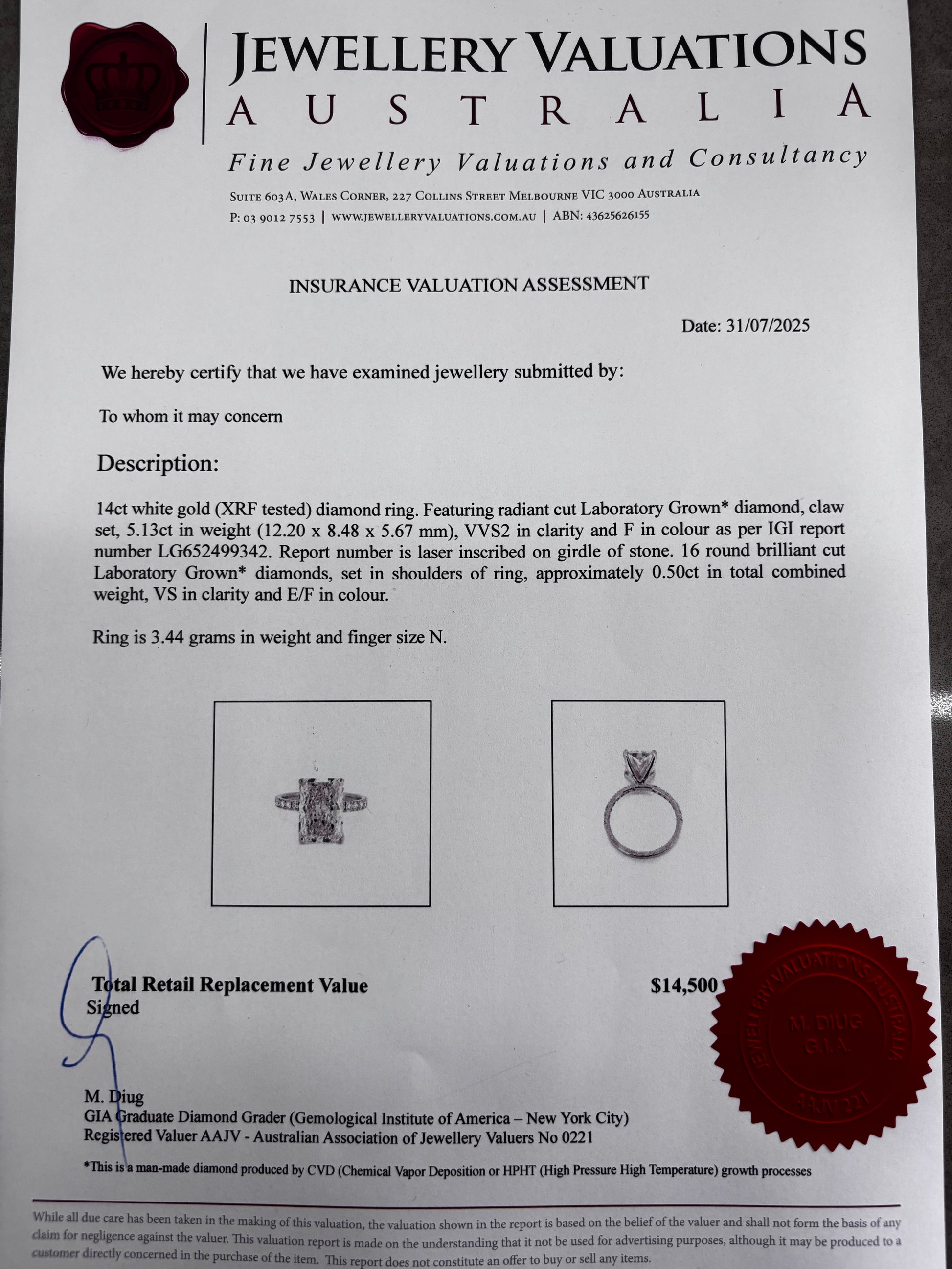 Make a statement with this spectacular 5.13ct radiant cut lab-grown diamond ring, expertly crafted in solid 14Kt white gold.